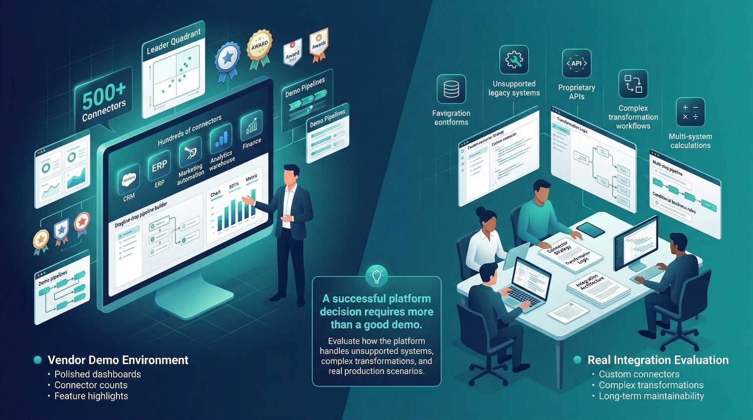 - The right tool for the wrong problem → An iPaaS solving application integration when the real need is data warehouse consolidation. Or consulting engaged for a simple connector setup that didn’t need it.