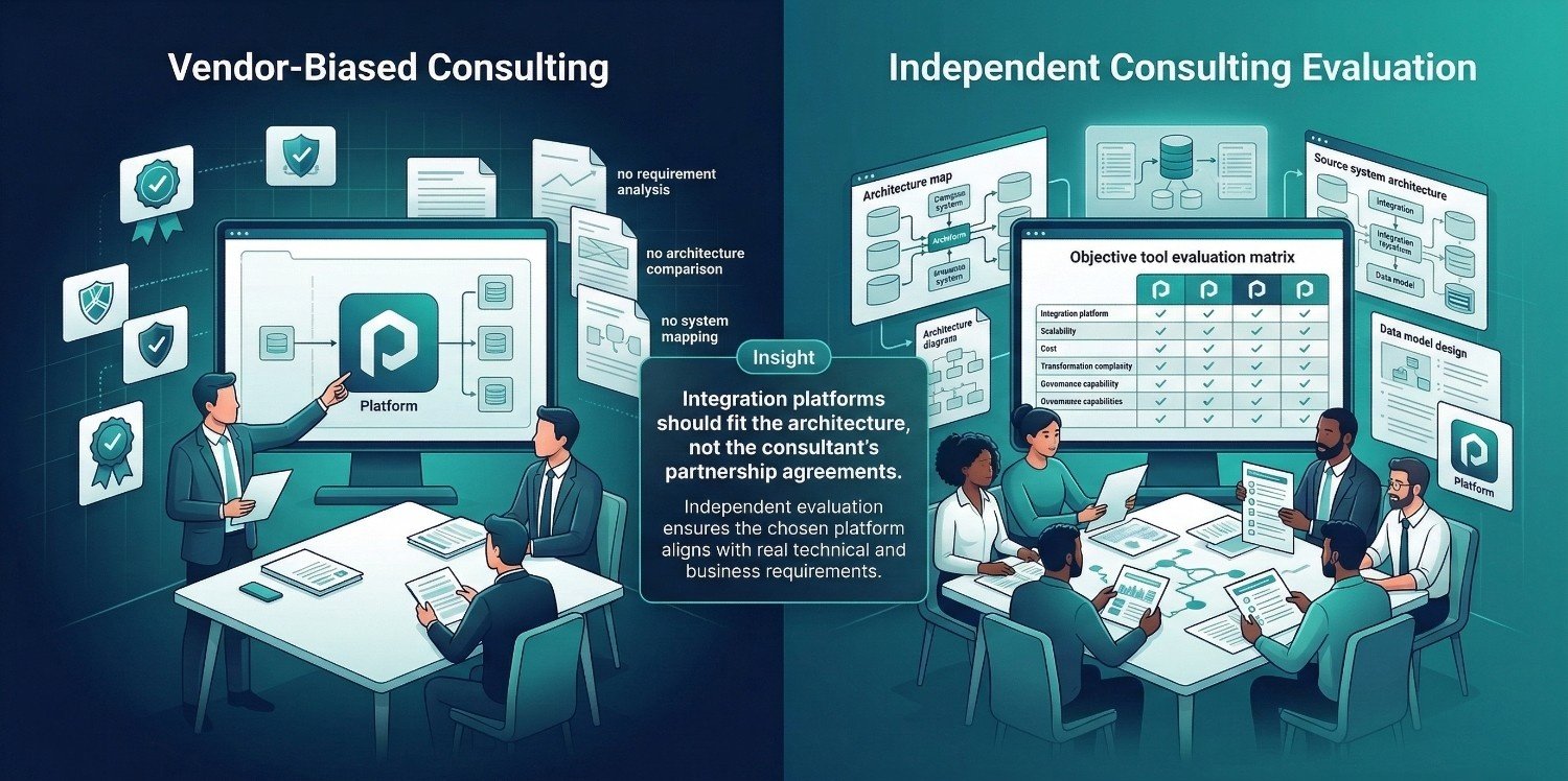 Consulting defines what you need. That definition informs which iPaaS platform, if any, is the right choice. Reversing this sequence leads to shelfware, rework, and wasted budget.
