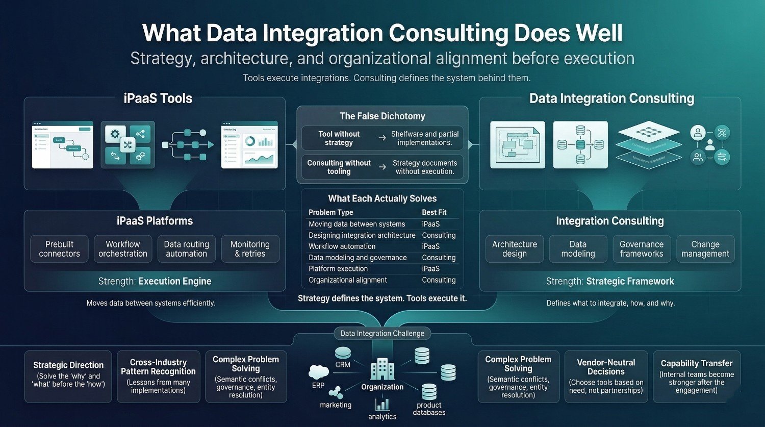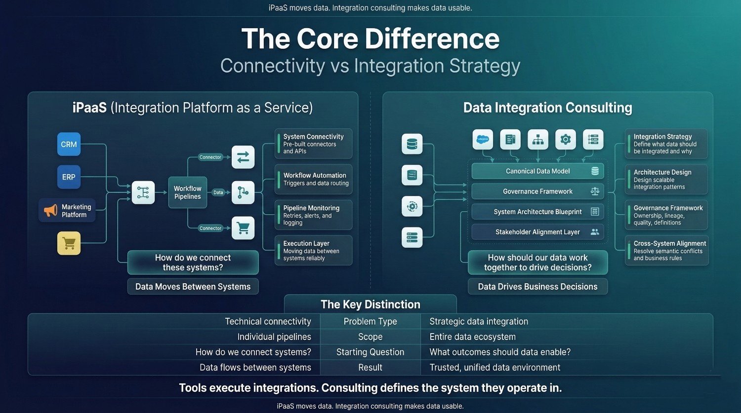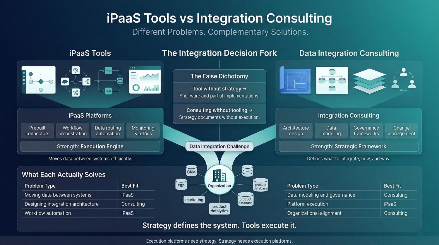 No. They solve fundamentally different problems. iPaaS solves the execution problem, how to connect systems and move data efficiently. Data integration consulting solves the strategy problem, what to integrate, why, in what architecture, with what governance, and for what business outcome.
