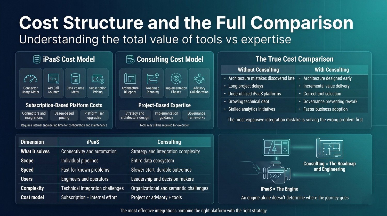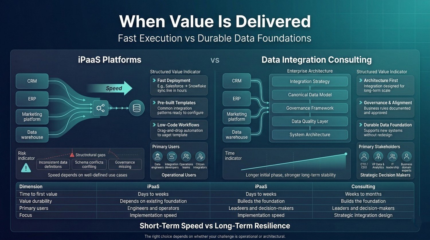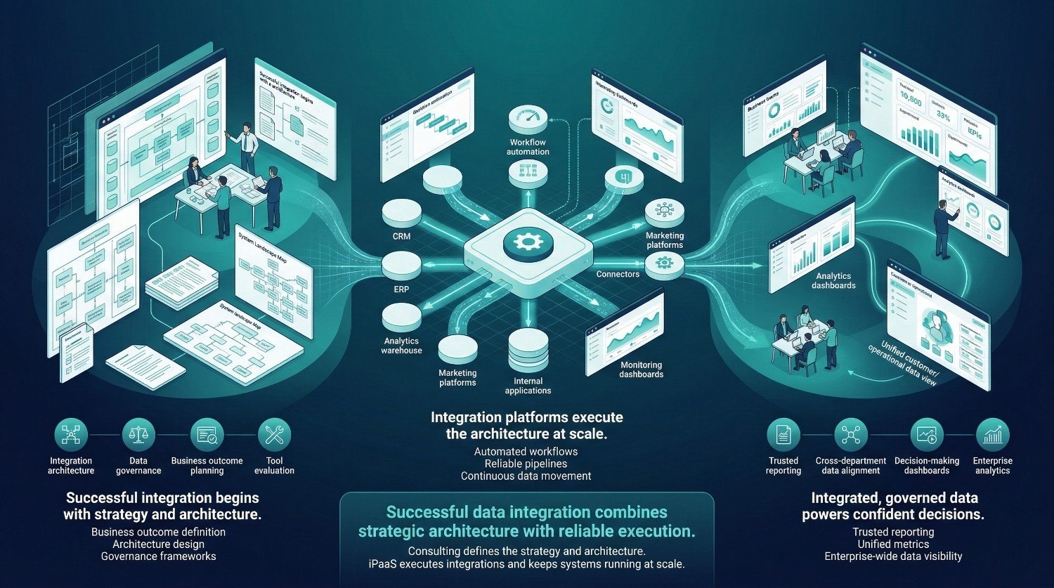 No. They solve fundamentally different problems. iPaaS solves the execution problem, how to connect systems and move data efficiently. Data integration consulting solves the strategy problem, what to integrate, why, in what architecture, with what governance, and for what business outcome.
