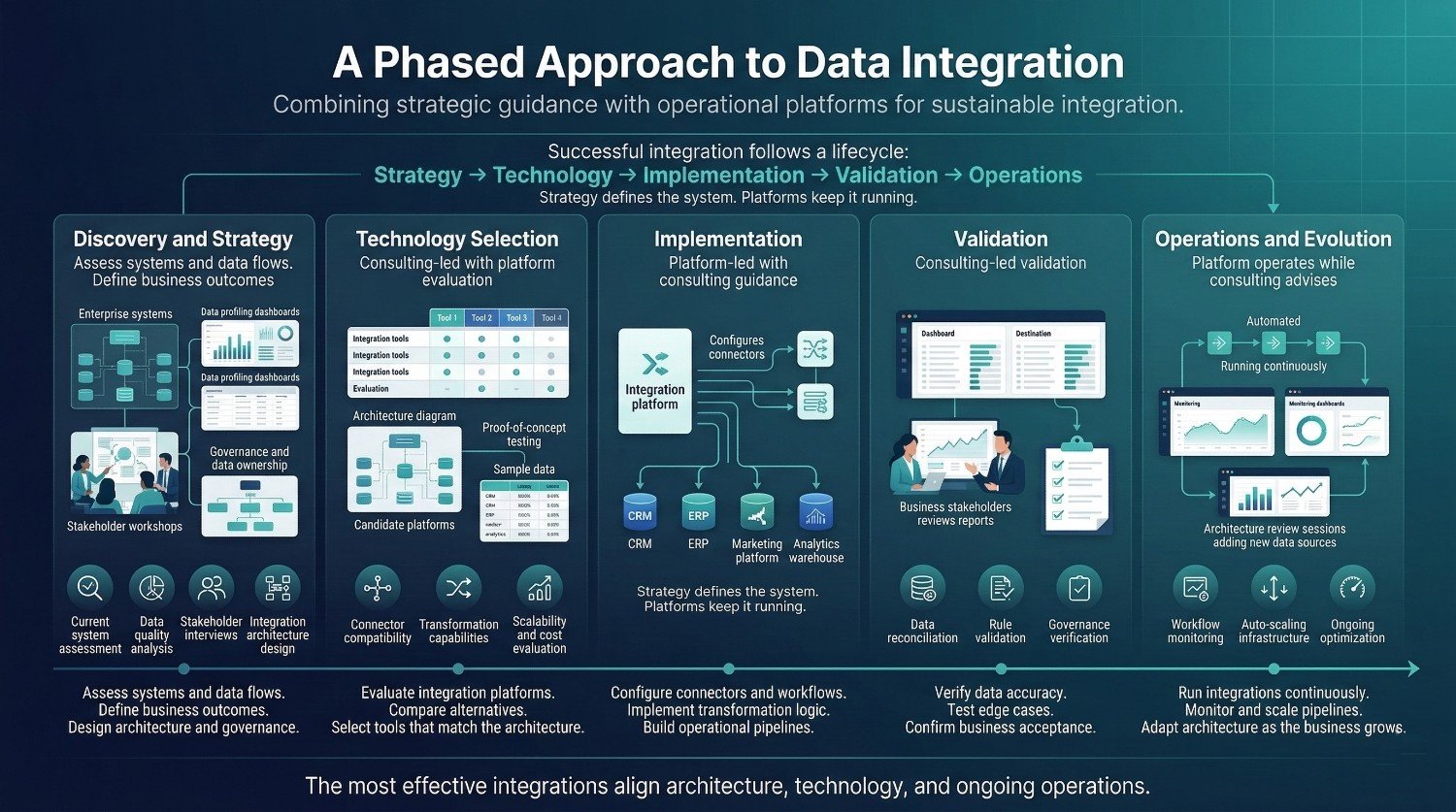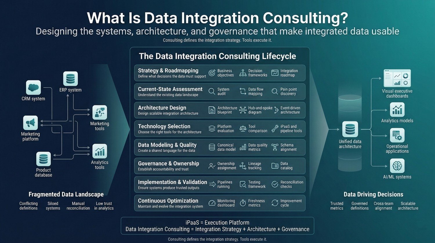 - Data integration consulting solves the strategy problem, defining what to integrate, why, in what architecture, with what governance, and for what business outcome