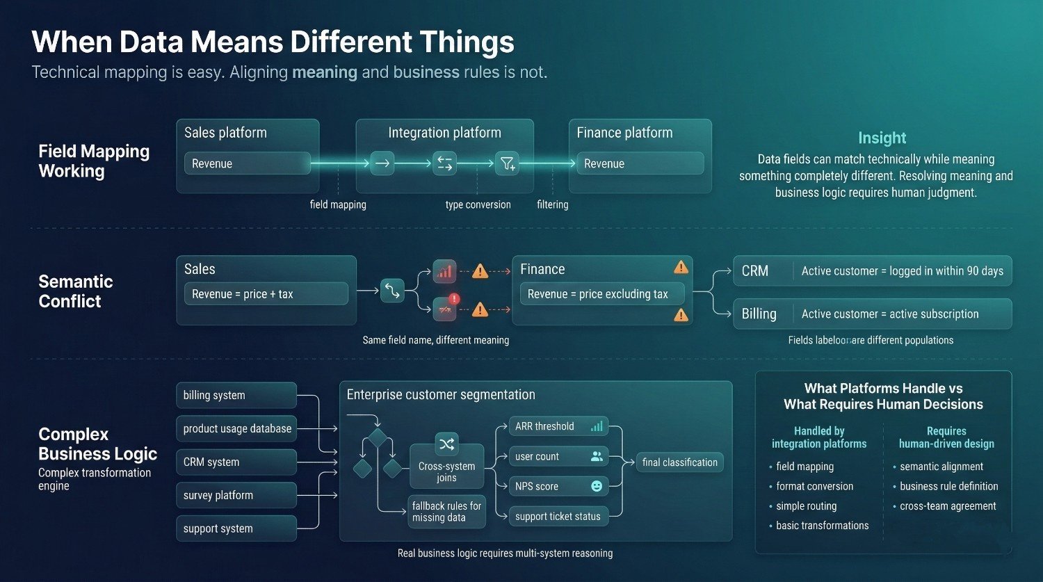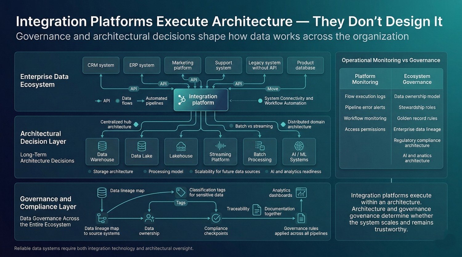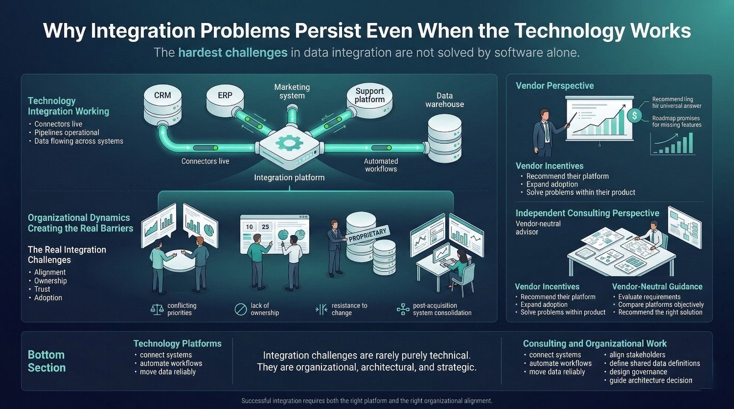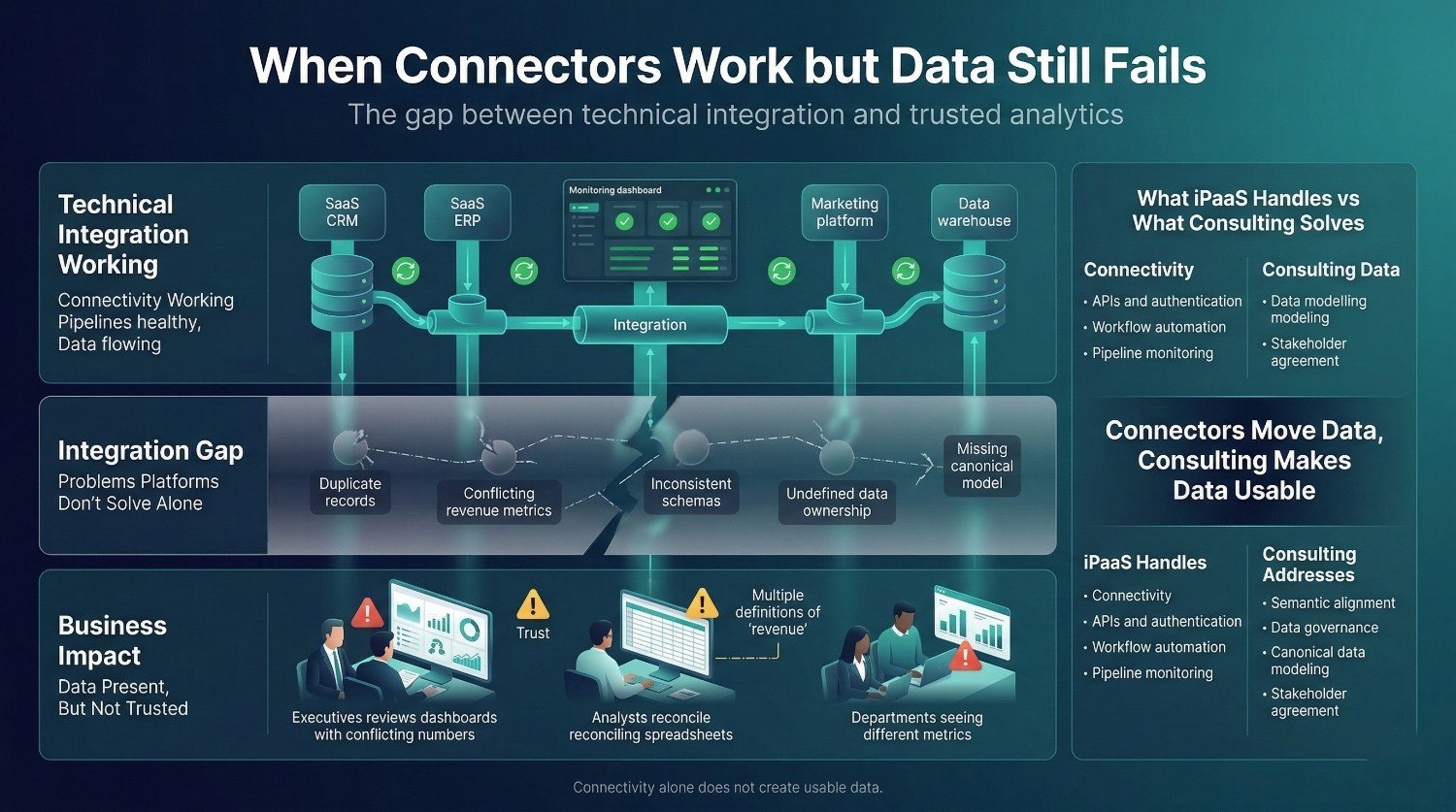 You can have a perfectly running iPaaS platform and still have failed integration if nobody defined the data model, reconciled conflicting business definitions, established governance, or ensured data quality. Those are consulting problems, not tool problems.
