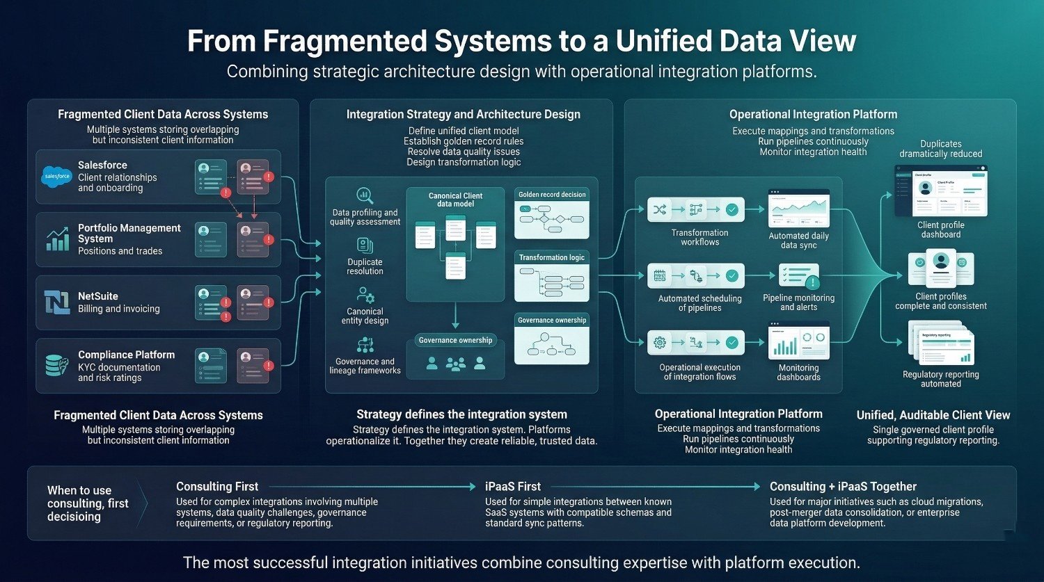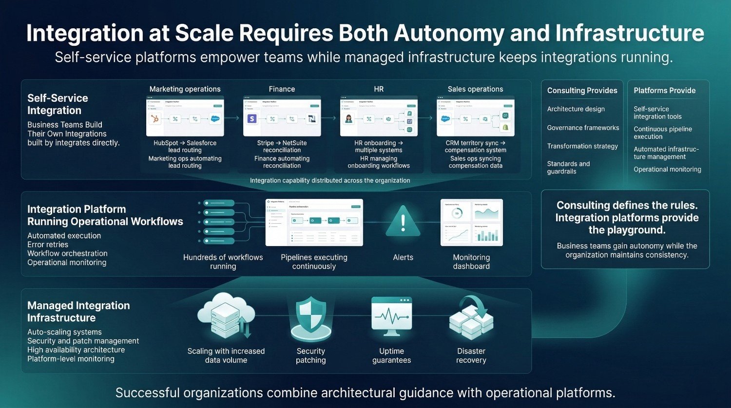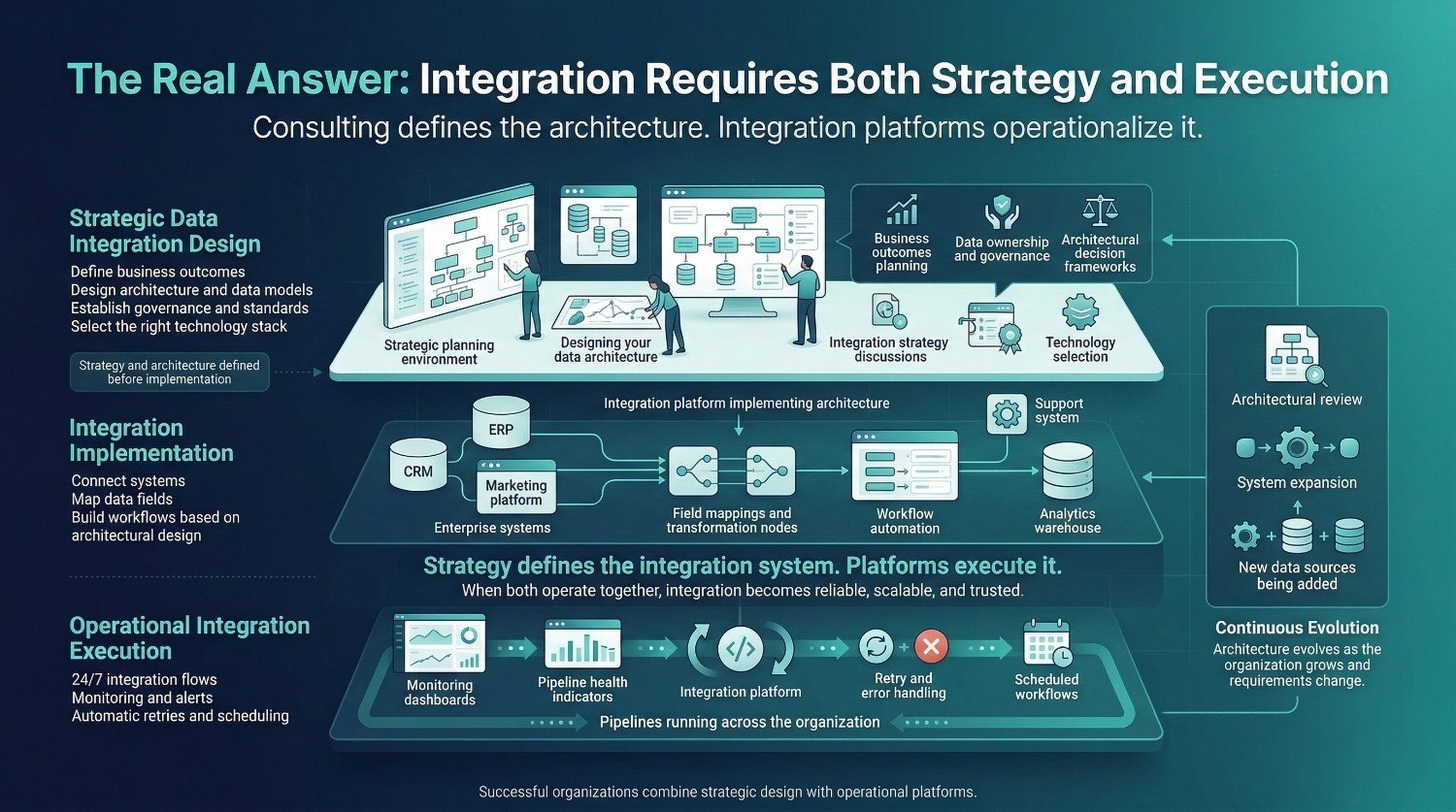 - They use consulting and iPaaS for what each does best. Consulting for the strategic, architectural, and organizational layers. iPaaS for the operational, execution, and infrastructure layers. No overlap. No gaps.