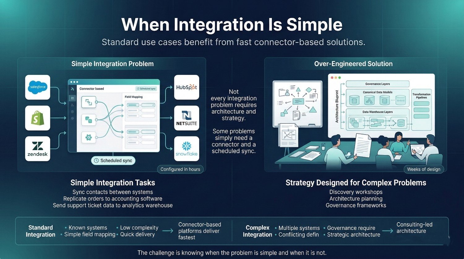 - Engaging consulting when you just needed a tool → Months of advisory work and a roadmap for a problem that a $30K/year connector platform could have solved in two weeks