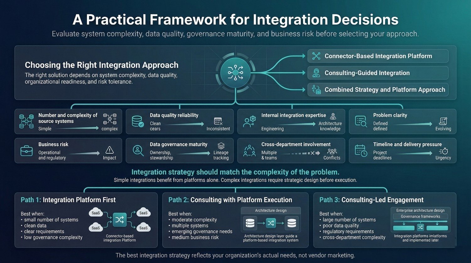 If your problem is straightforward connectivity between a few well-known systems, an iPaaS platform will serve you well. Buy it, configure it, move on. If your problem involves multiple sources, conflicting schemas, data quality issues, governance gaps, regulatory pressure, or organizational misalignment, you need data integration consulting to define the strategy before any tool can execute it effectively.