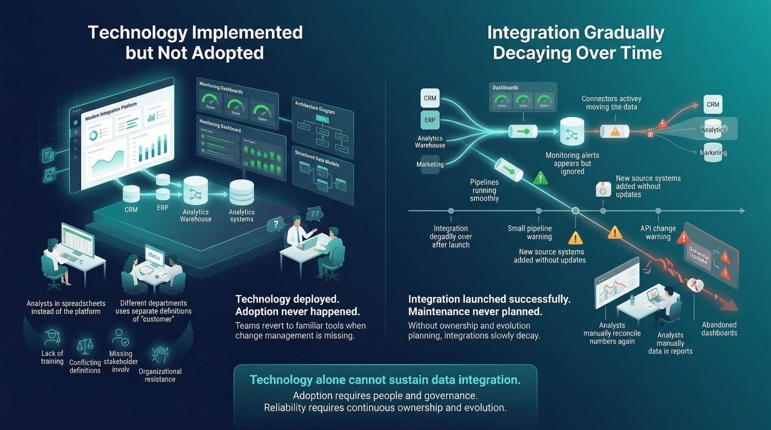 The platform addressed connectivity, but strategy and governance may have remained unaddressed, data quality, governance, semantic reconciliation, or organizational alignment. Those are the layers where integration actually succeeds or fails.