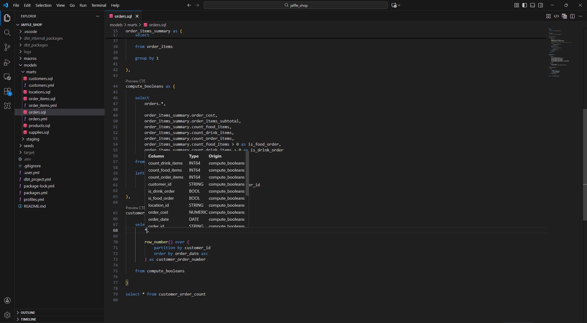 - Autocomplete that Trusts: When you type select user_, the editor doesn’t just guess words from the current document. It queries the AST, sees the upstream model’s schema, and confidently suggests user_id, username, and user_created_at.