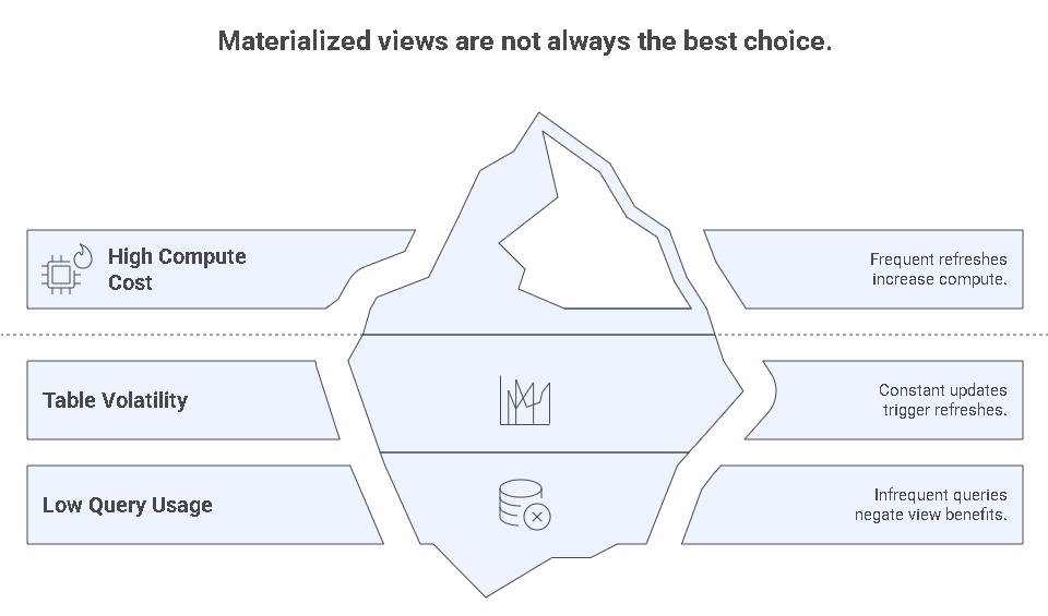 • Low Query Frequency: If a query runs rarely, the benefit doesn’t outweigh the cost of maintaining the view.