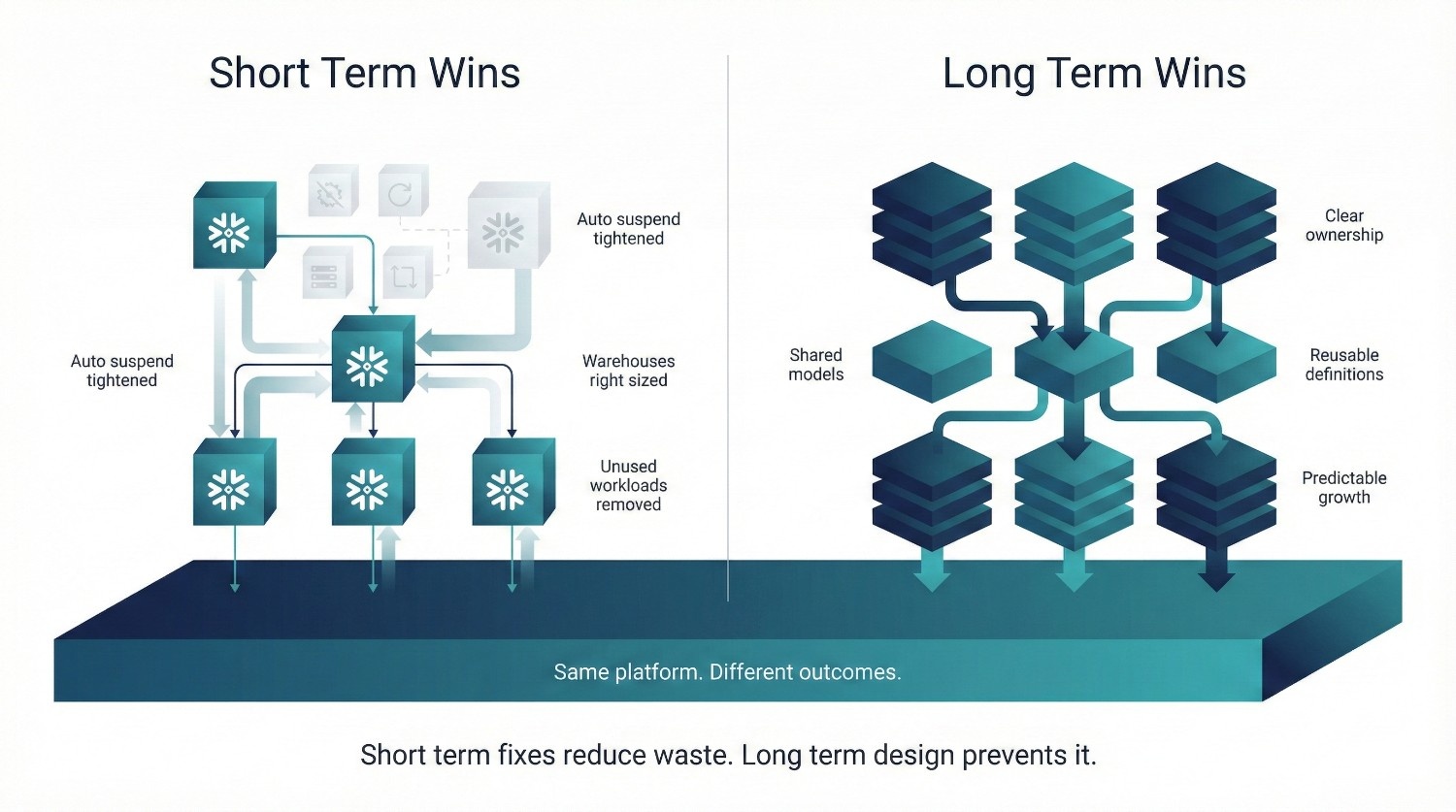 Because early optimizations usually fix symptoms, not behavior. Auto-suspend, right-sizing, and query cleanup reduce obvious waste, but cost becomes unpredictable again if ownership, modeling, and usage patterns remain unclear.
