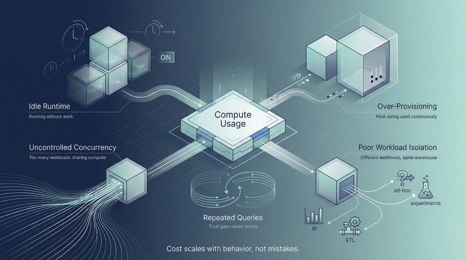 Compute usage driven by how long warehouses run and how often queries are repeated. Idle time, oversized warehouses, and redundant queries matter far more than storage.