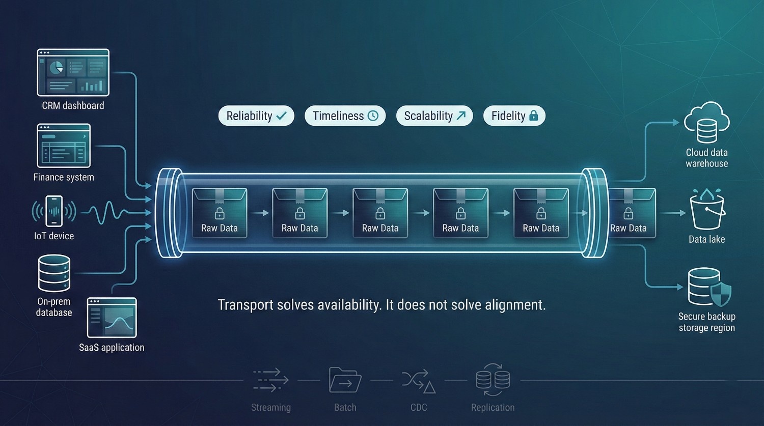 That’s it. No transformation. No enrichment. No interpretation. Just transport. Data movement solves availability. It does not solve alignment. Think of it this way: