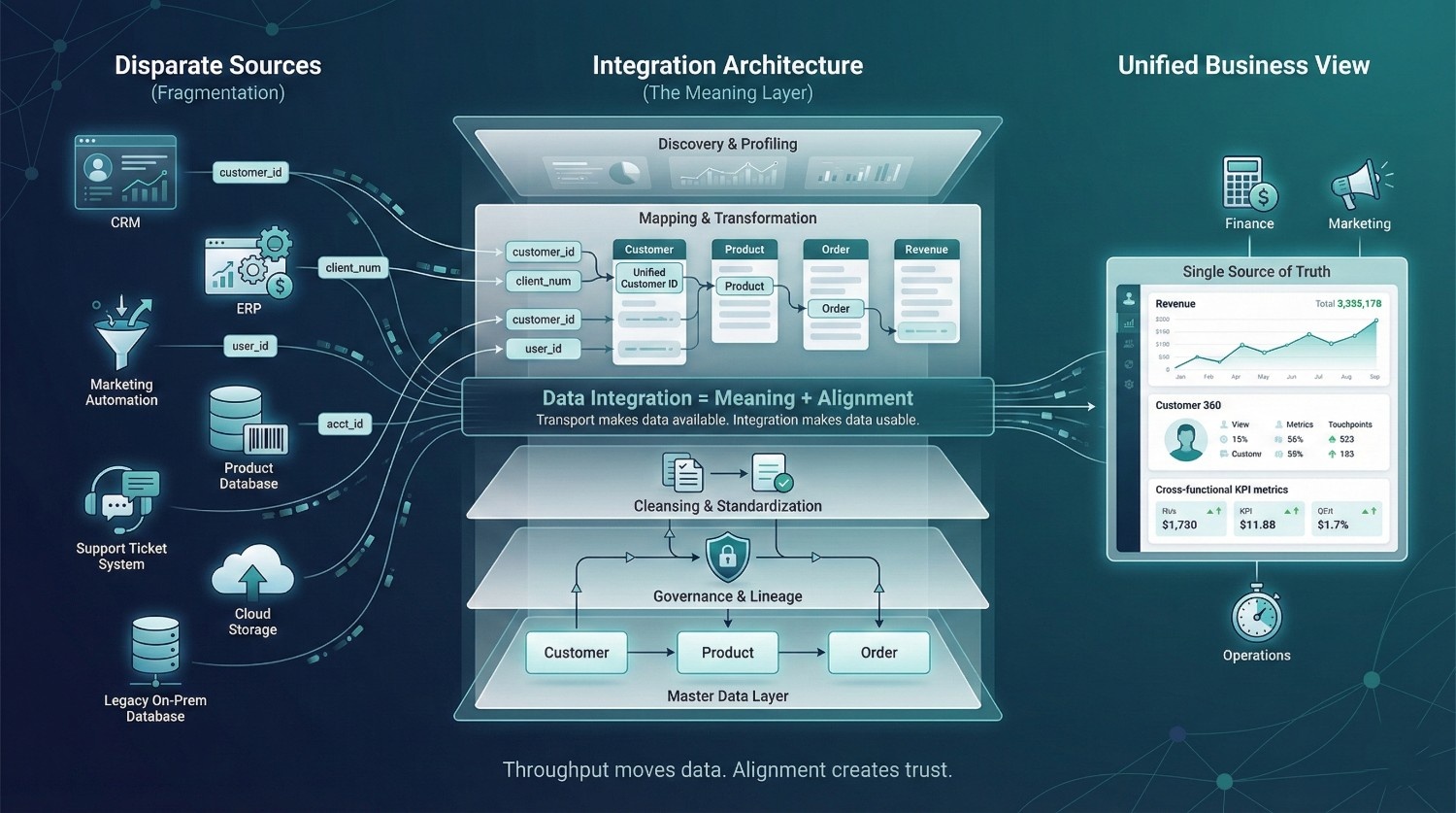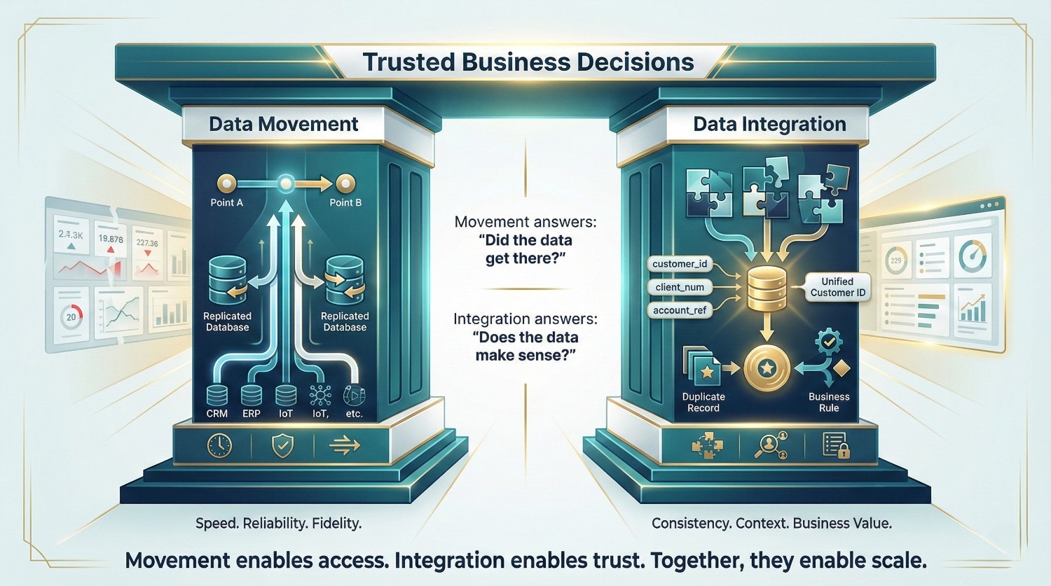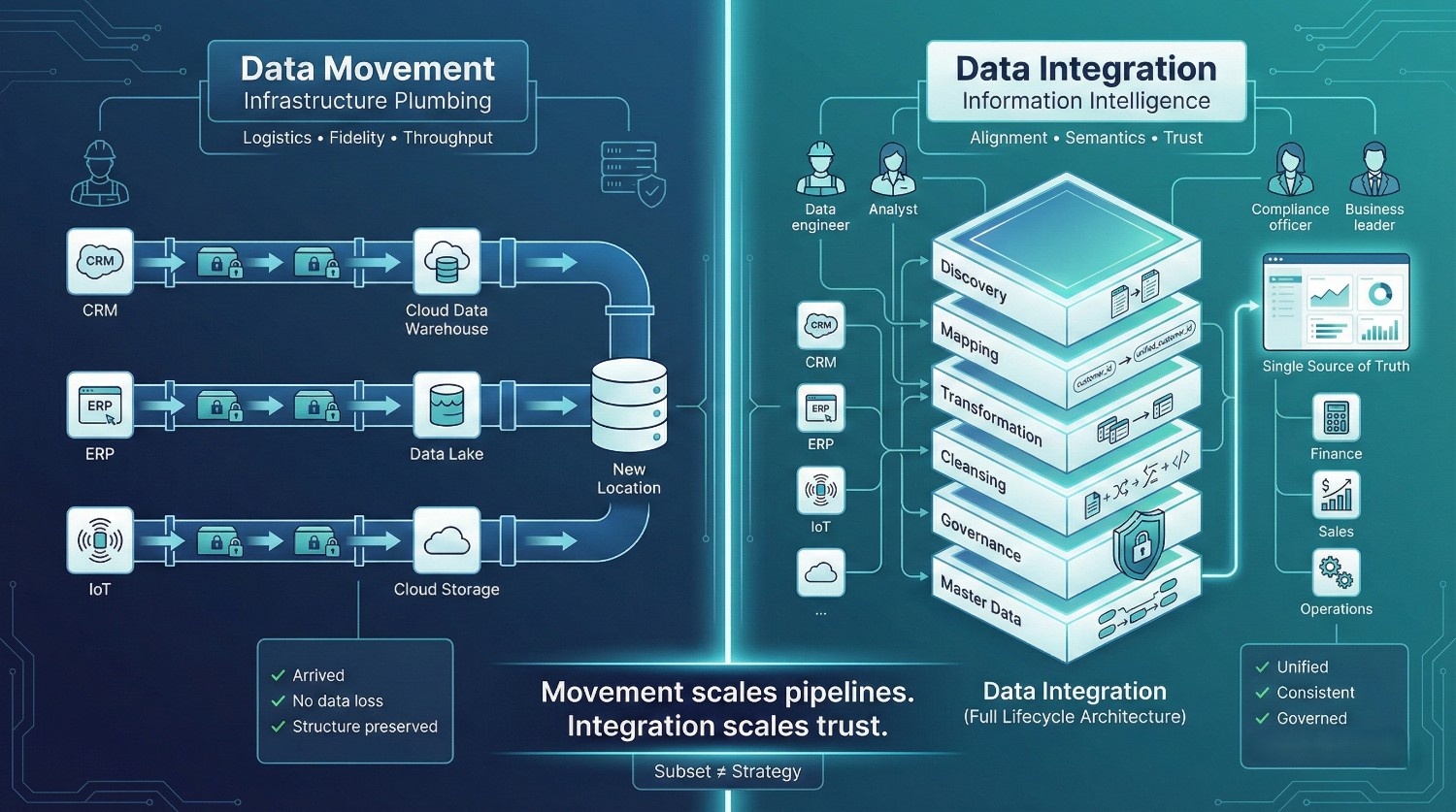 Data movement gets data from Point A to Point B. Data integration makes that data meaningful, consistent, and usable across the entire organization.
