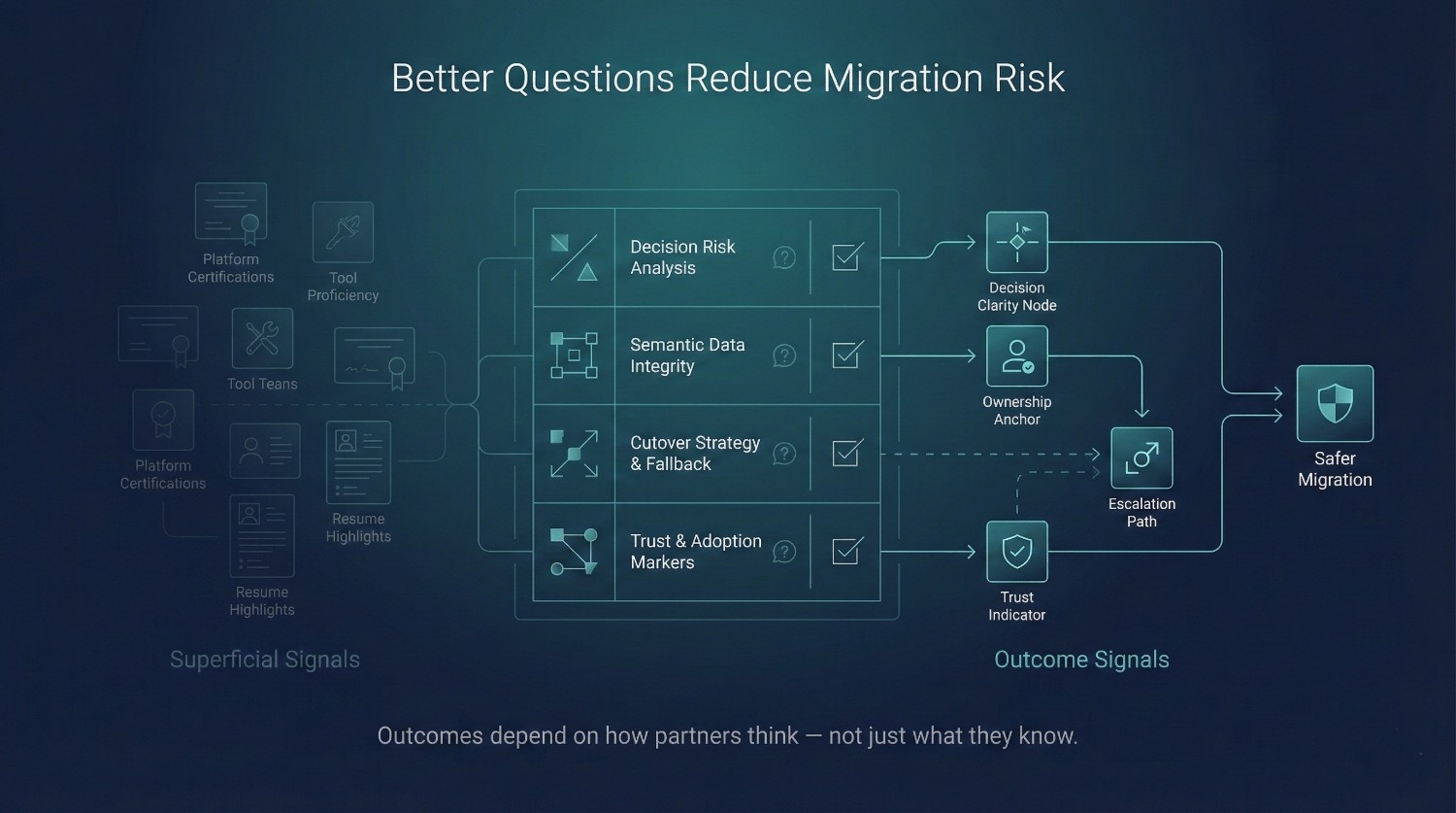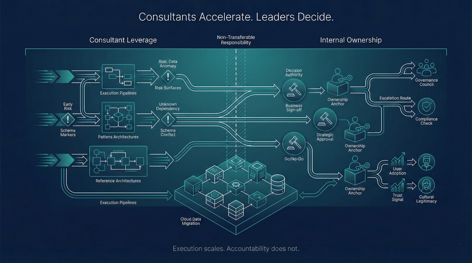 Enterprise migration frameworks consistently emphasize that external partners reduce execution risk, not decision or adoption risk. Oracle, Microsoft, and AWS migration playbooks all stress that governance, ownership, and change management must remain internal responsibilities—partners accelerate delivery, but they do not replace accountability.