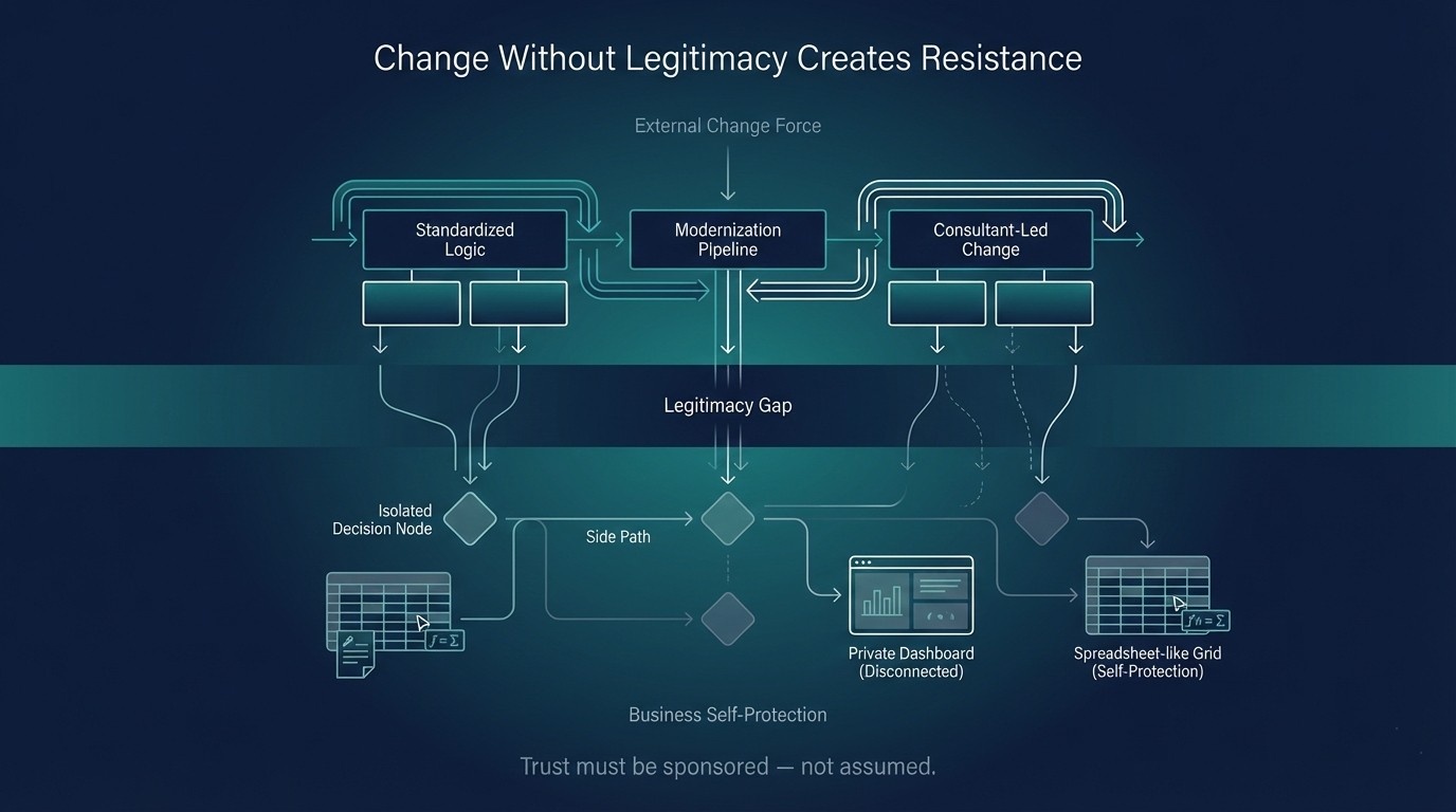 Because consultants are seen as outsiders who don’t absorb the consequences of change. Without visible leadership backing, business teams protect themselves by disengaging, delaying adoption, or maintaining shadow analytics.