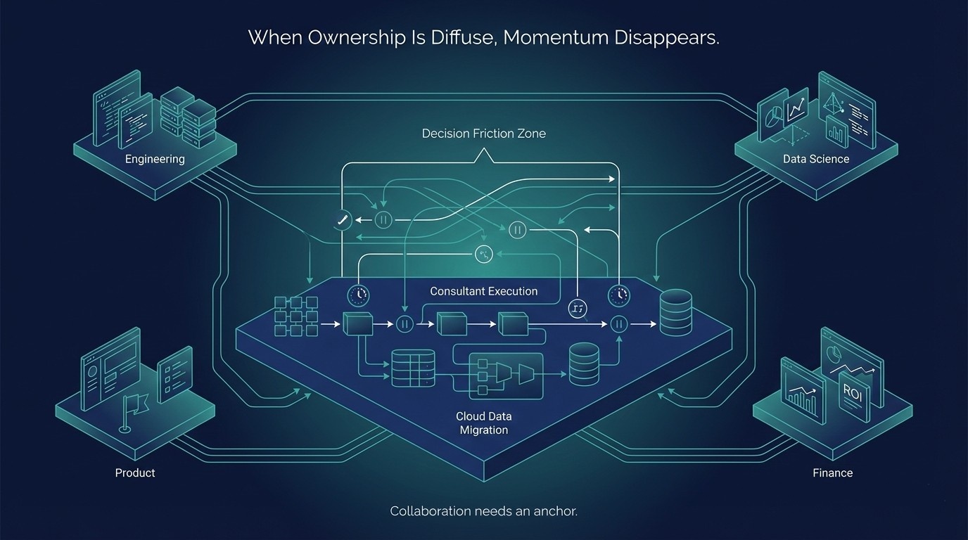One clearly named internal owner with end-to-end accountability. When consultants report to multiple teams, decisions stall, priorities conflict, and momentum collapses.