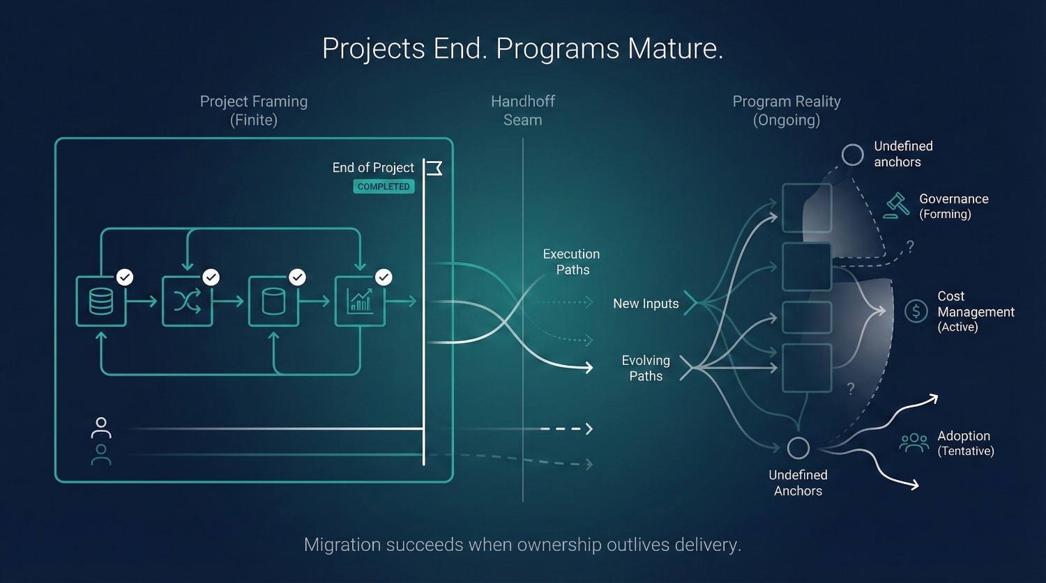 Because projects end, but data platforms don’t. When consultants leave after “Phase 1,” unresolved definitions, adoption gaps, and governance issues remain. Migration must be treated as a program, not a delivery milestone.