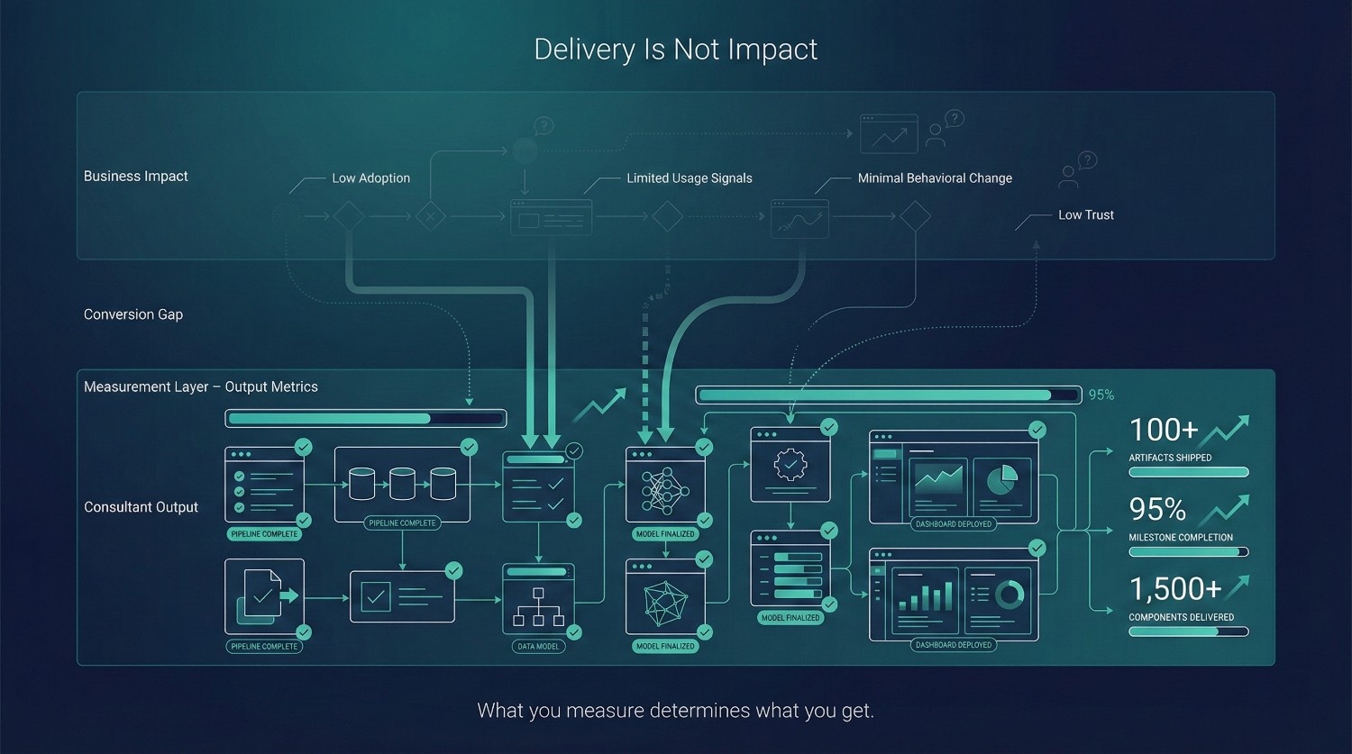 Because most failures are not technical. They come from unclear ownership, unresolved metric definitions, internal resistance, and deferred leadership decisions—none of which consultants can legitimately own or fix on their own.
