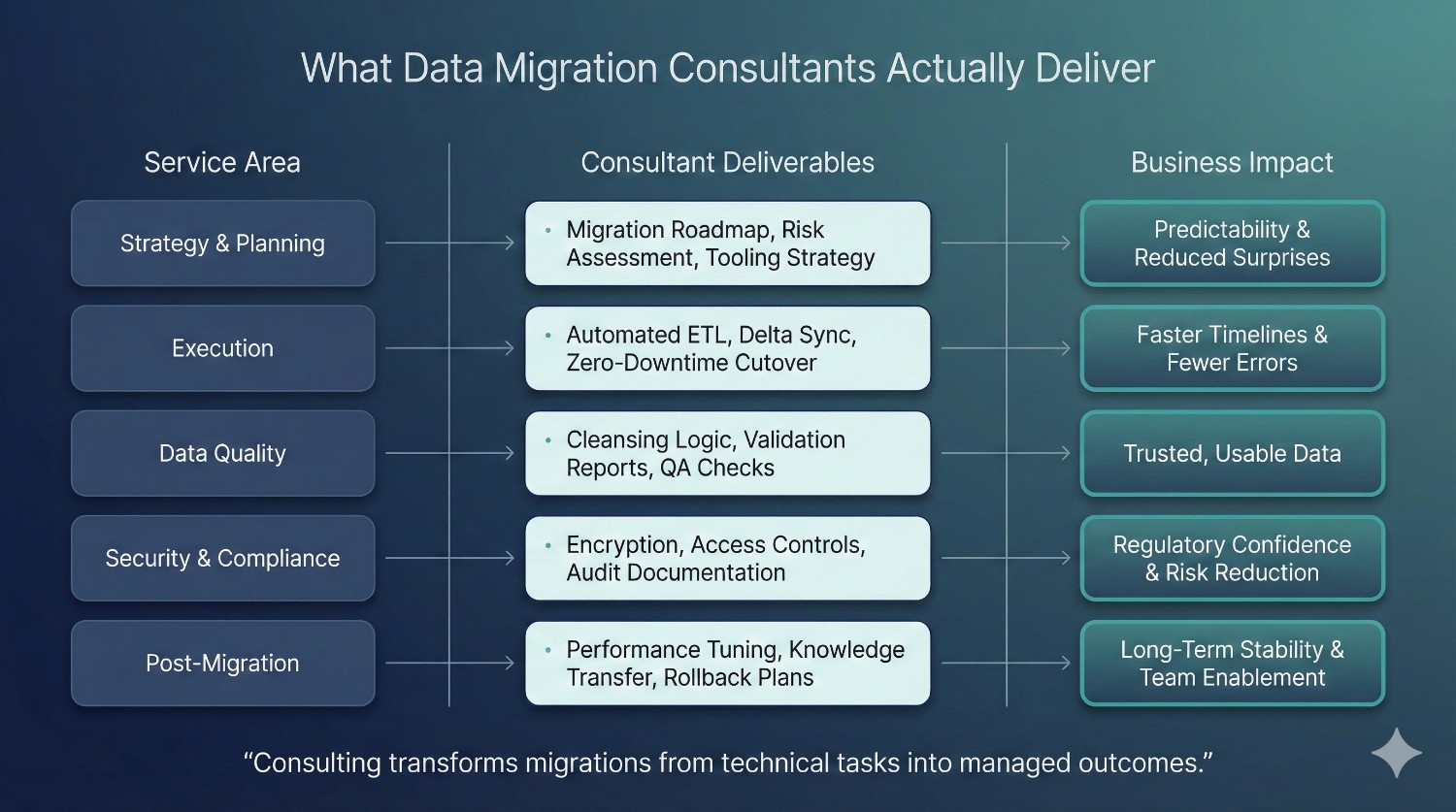 Consultants reduce risk by introducing structured migration frameworks, parallel environments, automated data reconciliation, clear cutover plans, and rollback strategies. This approach ensures issues are detected early and migrations are proven safe before becoming production-critical.