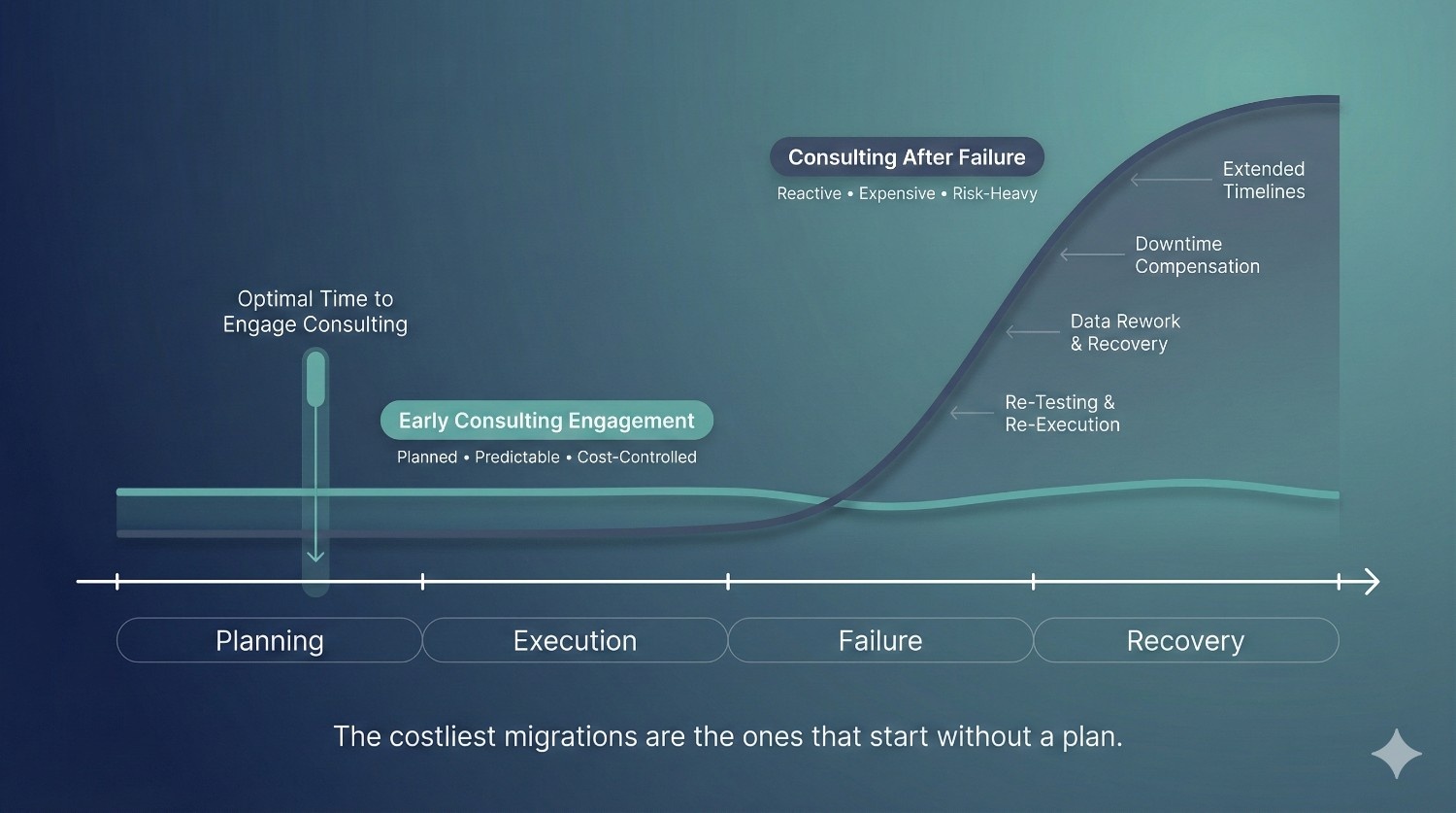 While consulting introduces an upfront cost, it frequently reduces total migration cost by preventing failed cutovers, re-engineering efforts, prolonged downtime, and uncontrolled cloud compute expenses after migration.