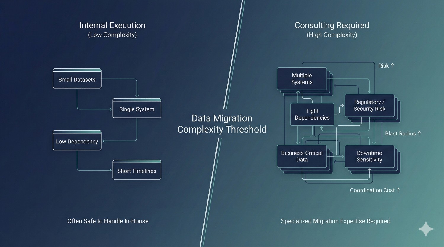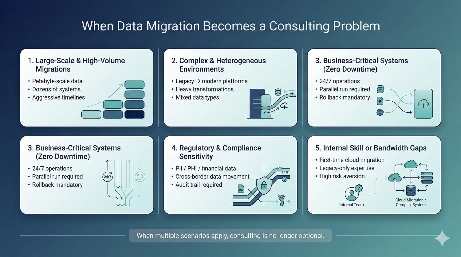 Data migration consulting becomes necessary when data is business-critical, multiple systems are involved, compliance requirements exist, or downtime and errors carry significant financial or operational risk. The need is driven by complexity and impact, not by company size.
