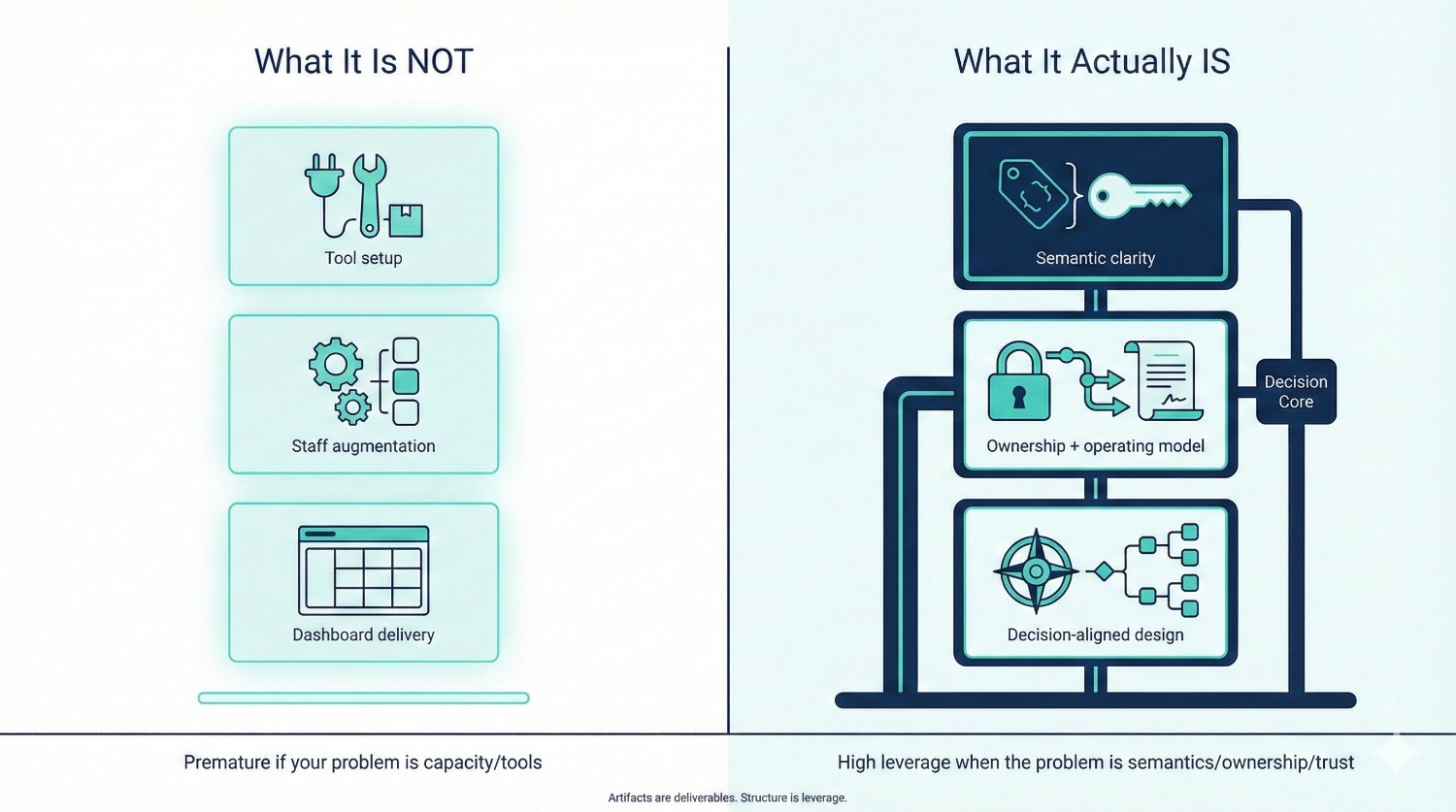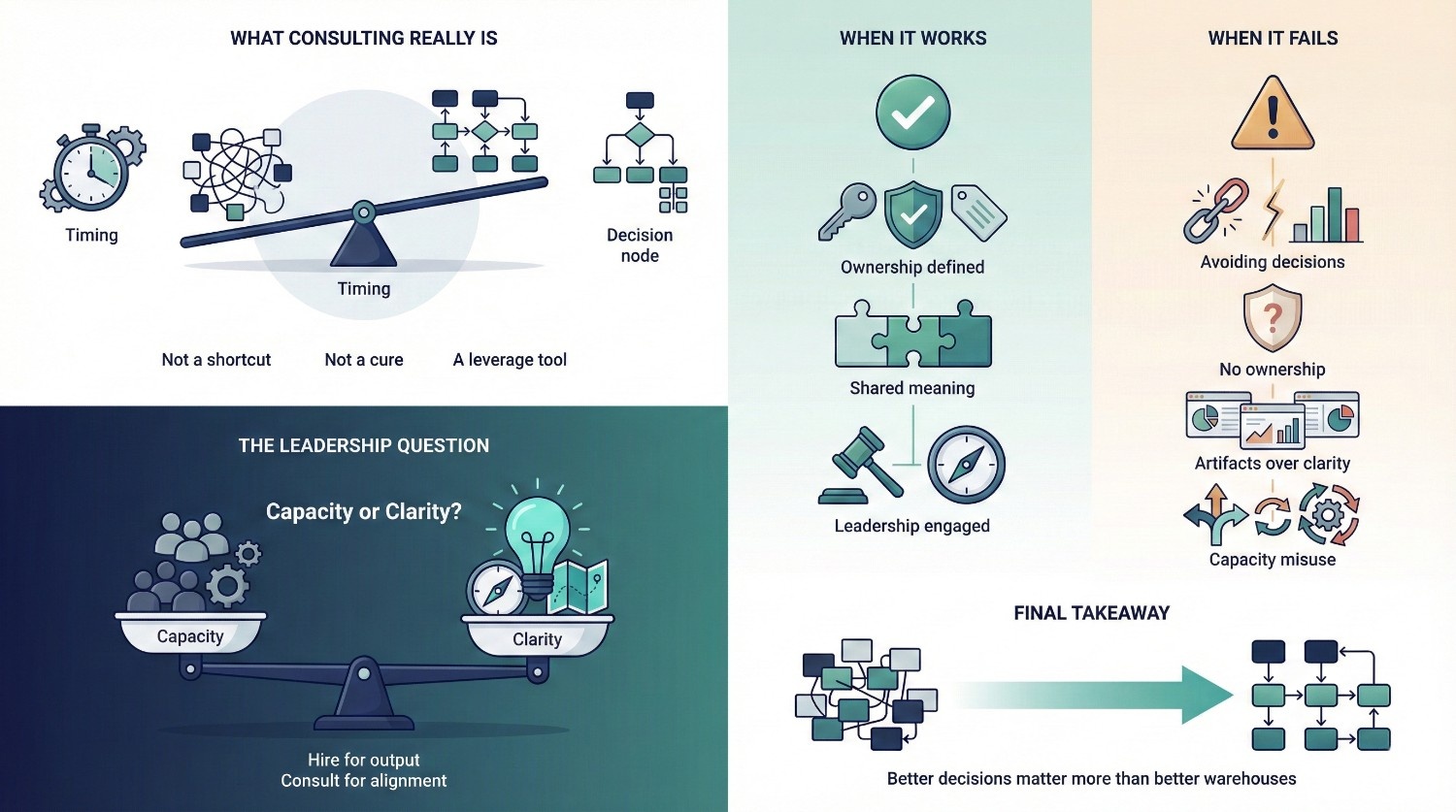A practical self-check is this. If most data questions are answered by the same people who build the data, consulting is likely premature. When those roles separate and disputes become frequent, leverage shifts. Consulting becomes valuable later,when internal fixes stop scaling and organizational complexity begins to dominate.