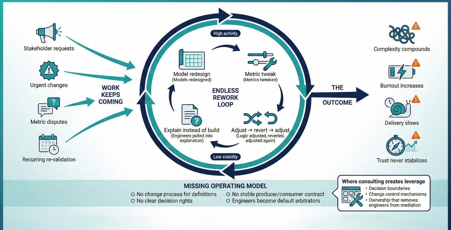 By the time help arrives, the problem is no longer technical. It is organizationally entrenched. They delay consulting for too long. They keep adding workarounds, allow every team to define metrics independently, and scale data volume without scaling structure. By the time they bring in help, confusion is already baked into systems, processes, and expectations.