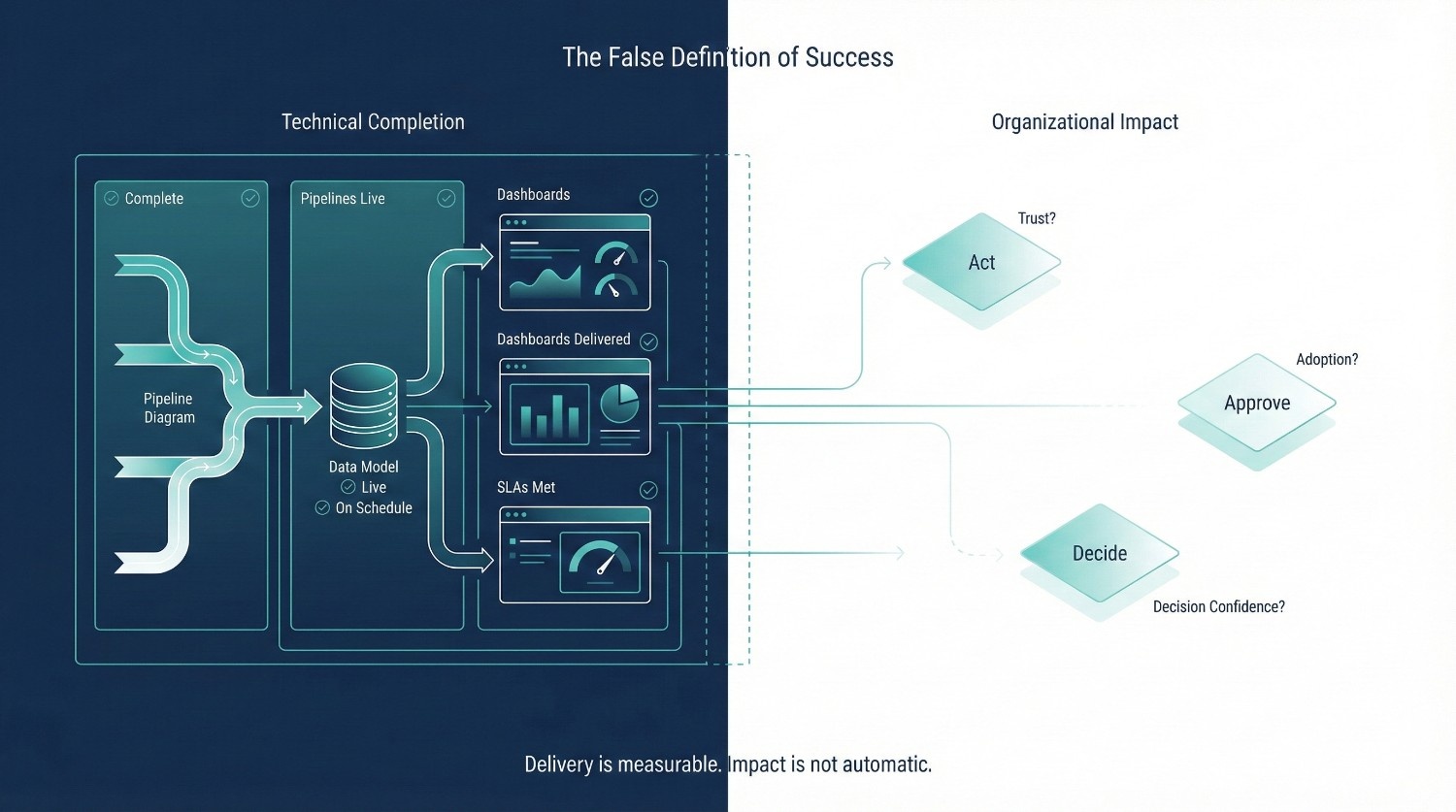 No. That is technical completion, not organizational impact. Success is measured by whether people trust the numbers, use them confidently in decisions, and stop maintaining parallel systems.