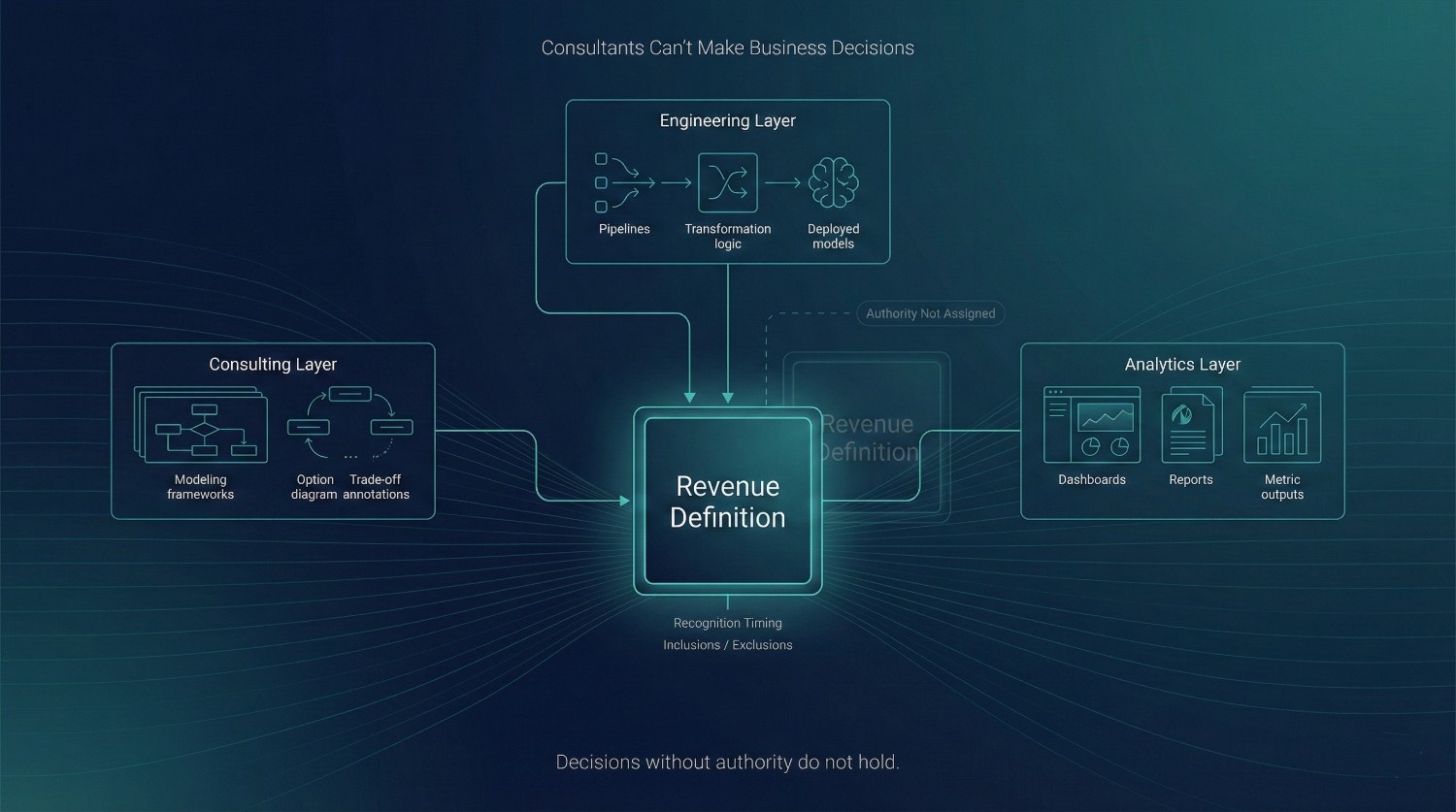 Consultants can recommend and model options, but they lack the authority, accountability, and political cover to decide metric definitions, historical corrections, or tradeoffs. When forced into that role, trust collapses.