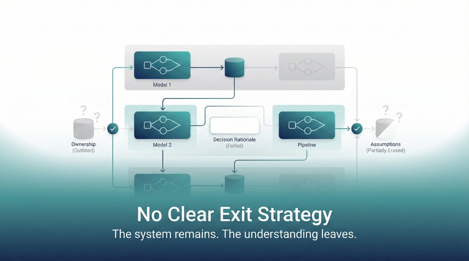 Without intentional knowledge transfer, internal teams inherit complexity without context. Fear replaces confidence, and the system slowly decays after consultants leave, even if nothing breaks immediately.