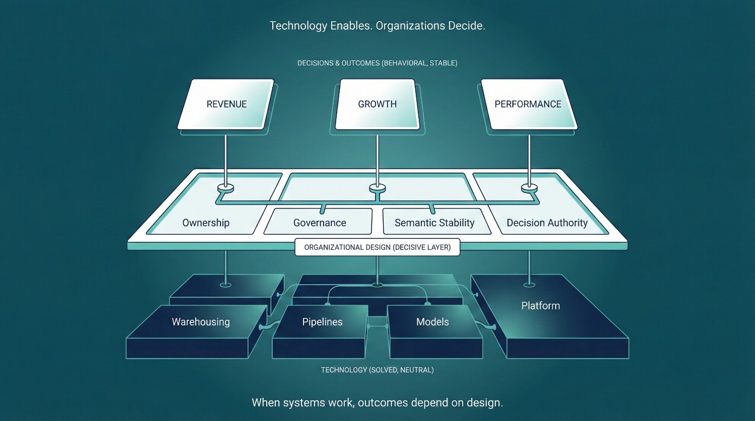 Because technology alone doesn’t change how an organization makes decisions. When ownership is unclear, semantics are unstable, governance is avoided, and trust isn’t actively built, even perfectly functioning systems fail to be adopted.